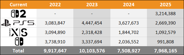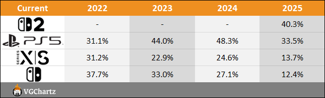 ここでは消費者を通じたデータが見られますが、2022年中に任天堂の移行は2022年、2023年、2024年、2025年に実施されます。また、同じ期間の憲法ごとのシェアもあります。